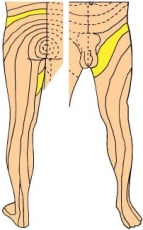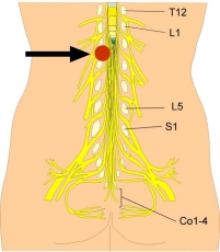 | Du markerade beteckningen som motsvarar område L2. Du kan ha ett tryck på nervroten som löper ut mellan ländryggradskotorna L2 och L3, åt vänster. En röd boll och en svart pil markera det troliga området där nervroten är utsatt för tryck, eller annan påverkan. | |||||||||||